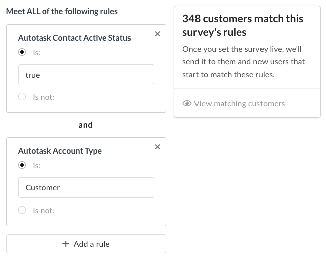 The easiest way to get customer feedback through Autotask Integrate CSAT, or CES (Customer Effort Score) feedback into your Autotask ticket notifications and automates quarterly email NPS (Net Promoter Score) surveys. ✨ How Simplesat works with Autotask View all features in Simplesat Click to view how Simplesat works with Autotask 😍 Add CSAT surveys to closed ticket emails Embed one-click CSAT or CES surveys directly into closed status Autotask ticket notifications. ✅ Easily create an Autotask survey ✅ Easy copy/paste process takes less than 5 minutes ✅ Including survey in existing notifications means no extra emails for your clients 🔄 Sync Autotask ticket details with feedback Gain further context about feedback by retrieving ticket info through the Autotask API. ✅ Sync contacts, companies, boards, departments, ticket owners, and resources ✅ Link team members with ticket owners, or the member with most time entered 📝 Add feedback to internal notes Sync ratings with Autotask ticket notes to increase visibility and transparency. ✅ Display ratings and comments directly in ticket notes ✅ Make it easy for techs to see feedback without switching tools ⭐ Update Autotask user defined fields with feedback Connect ratings with ticket UDFs (User Defined Fields) to enable automations and detailed reporting. ✅ Sync ratings and comments with specific custom fields ✅ Can be used for Autotask workflows, automations, or dashboard reporting 🙌 Import and sync Autotask contacts Getting your contacts into Simplesat enables automating surveys, and makes sure your records are always up to date. ✅ Sync contact and company attributes daily ✅ Ensure survey audiences are correctly targeted ✅ Filter reports by contact and company attributes 🤖 Automate NPS surveys Put your quarterly customer surveys on autopilot by emailing directly from Simplesat. ✅ Create target audiences based on synced Autotask contacts ✅ Send branded emails from your domain ✅ Simplesat is a licensed Net Promoter Score vendor 📊 Detailed client reporting Create reports for a client, shareholder, or your team members! ✅ View survey score, stats, trends and leaderboards ✅ Filter by company, customer, team member, or any Autotask attributes synced through tickets or contacts ✅ Drill down to see details for any specific stat or time period ✨ Find out how real businesses are improving customer satisfaction with Simplesat