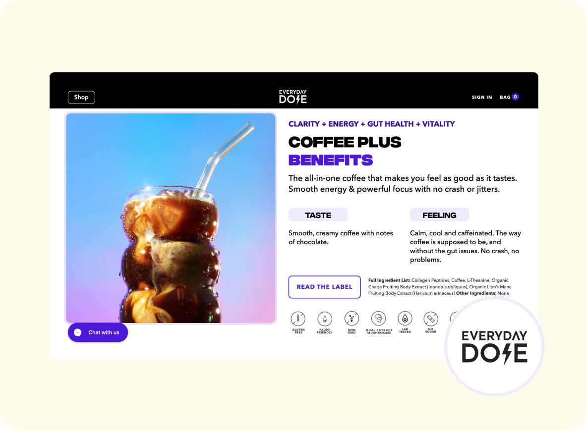 Everyday Dose offers a coffee blend enhanced with functional mushrooms, aminos, and collagen. It’s made to deliver mental clarity and daily wellness without the jitters, energy crashes, or stomach discomfort that many people get from regular coffee.