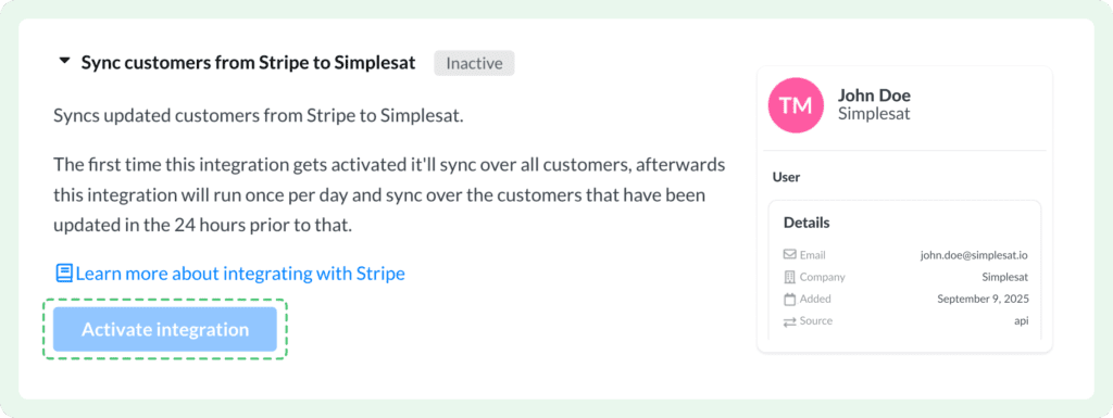 The integration takes a few minutes to set up: create a restricted API key in Stripe (under Developers → API keys) with read-only access to Customers and Events, then paste the token into Simplesat’s Stripe integration page. From there, activate the customer sync — no code or complex configuration required.