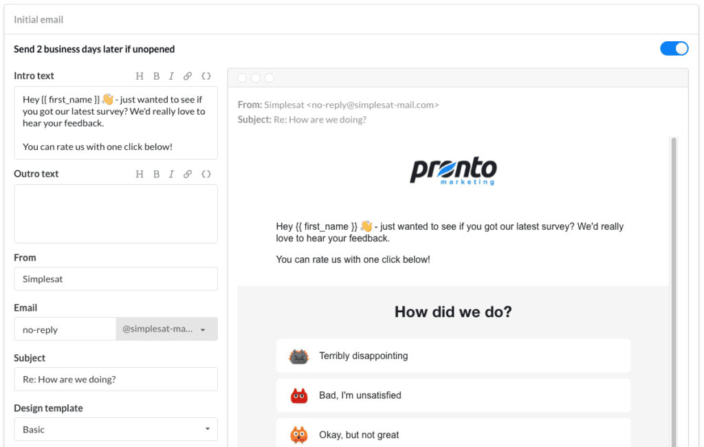 Pro tip: the defaults in Simplesat are 2, 5, and 10 business days later if unopened. We can manually change any of these delay intervals, or the condition from unopened to “unclicked”. Just shoot us a message if you’re interested.